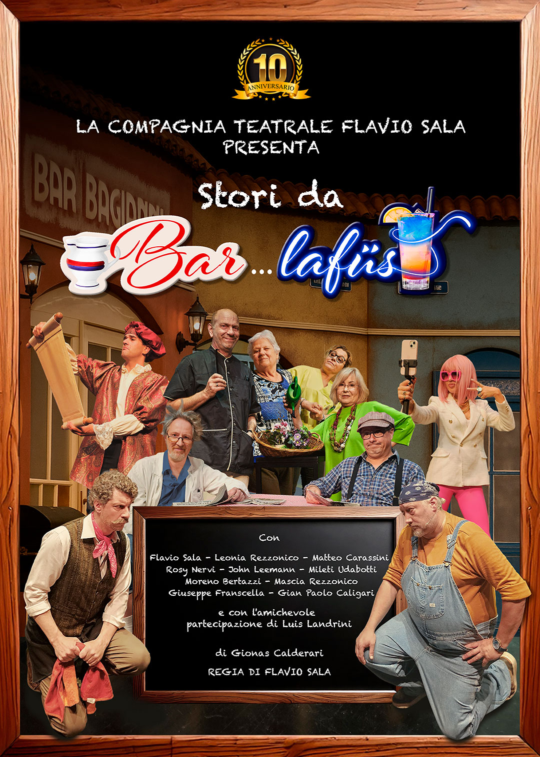 La Compagnia Teatrale Flavio Sala è nata nel 2014 da un’idea di Flavio Sala, attore, comico e cabarettista poliedrico della Radiotelevisione Svizzera Italiana, noto al vasto pubblico anche in virtù della sua irresistibile interpretazione del personaggio del frontaliere Roberto Bussenghi. Siamo una Compagnia professionale che crede nei benefici apportati alla collettività dal sorriso e dal buon senso popolare e si prefigge di mantenere viva e vitale la commedia dialettale. Le nostre produzioni impegnano volti conosciuti del teatro e dell’intrattenimento affiancati a giovani talenti e puntano a divertire e a fare riflettere gli spettatori, prediligendo toni leggeri ma mai scontati o superficiali. La nostra sigla distintiva è il fresco connubio tra il ricco e imprescindibile patrimonio della tradizione e le sollecitazioni della vita contemporanea e del mondo moderno.